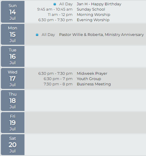 Pastor Willie and Roberta’s ministry anniversary is tomorrow. They have been faithfully serving here for 23 years! We are planning a party to celebrate on July 27, 2024 at 4pm here at the church. Emily is planning hot dogs and hamburgers with all the fixings. If you would like, bring a side dish or dessert.