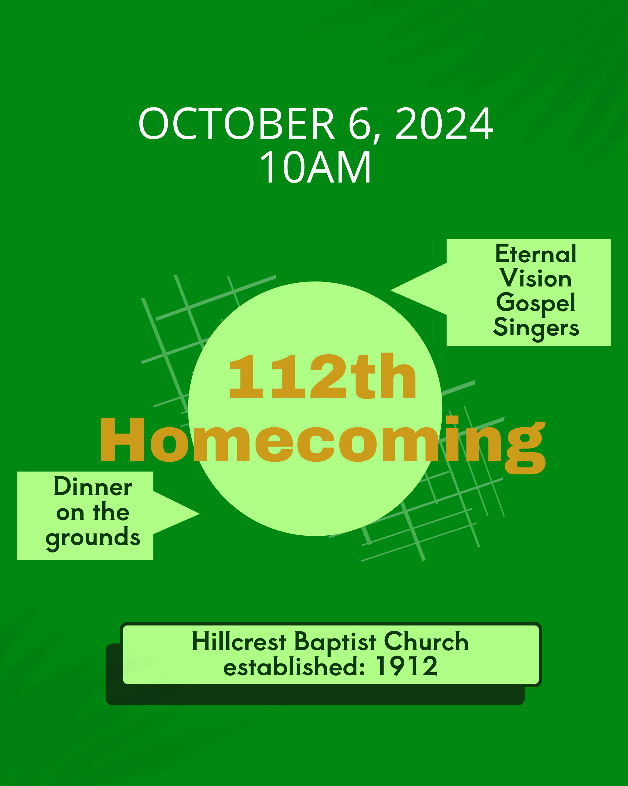 Homecoming will be October 6! Eternal Vision will be here for special music. The meat will be provided. Bring sides and a dessert.